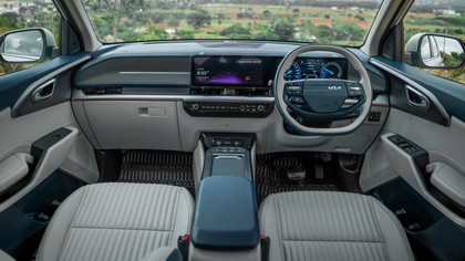 The interior configuration of the Carens Clavis EV is mostly similar to that of the ICE-powered model, including the twin-screen arrangement, two-spoke steering wheel, and dashboard design. The EV feels lighter and more upscale thanks to its dual-tone white and grey interior, which is typically reserved for the ICE model’s lower-end models.